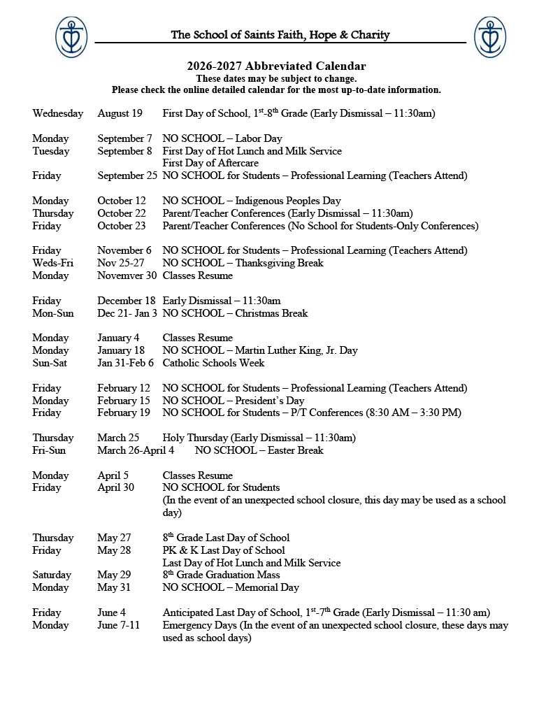 In the fall of 1939, the Dominican Sisters of Sinsinawa founded the School of Saints Faith, Hope & Charity. A parochial, Catholic grade school located in Winnetka, Illinois and part of the Archdiocese of Chicago, FHC educates children in the formative years of 3-year-old Pre-Kindergarten through eighth grade. Named a National Blue Ribbon School of Academic Excellence in 2014 and again in 2023, our students receive opportunities to master challenging academics, excel on team sports, perform before large audiences, and lead service projects. Our students learn a way of life – one that weaves Catholic spirituality and moral development within academic studies and co-curricular achievement. Our school mission is to provide an educational environment that develops the spiritual, academic, moral, and social growth of each student.